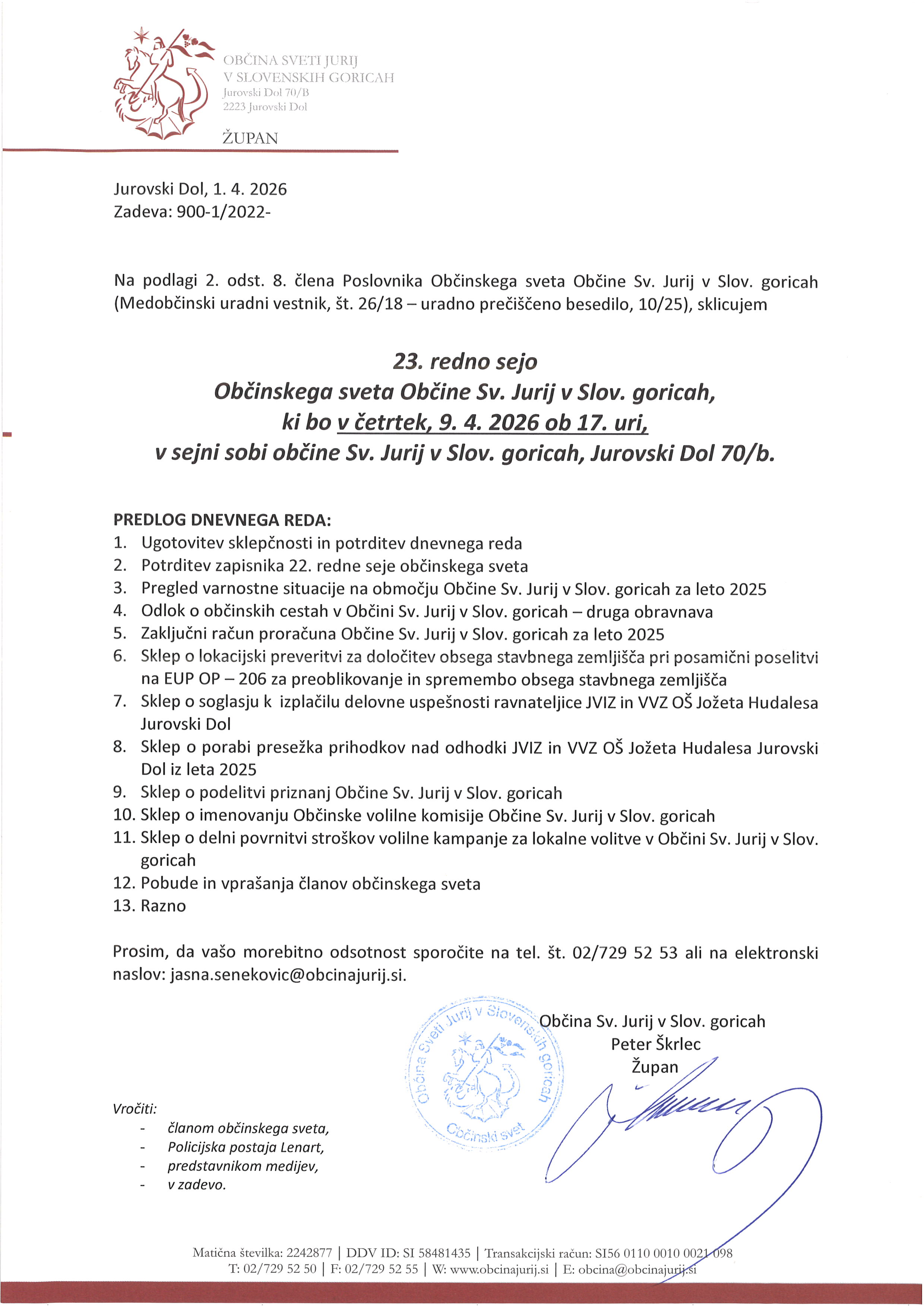 Župan Peter Škrlec je sklical 23. redno sejo Občinskega sveta Občine Sv. Jurij v Slov. goricah,