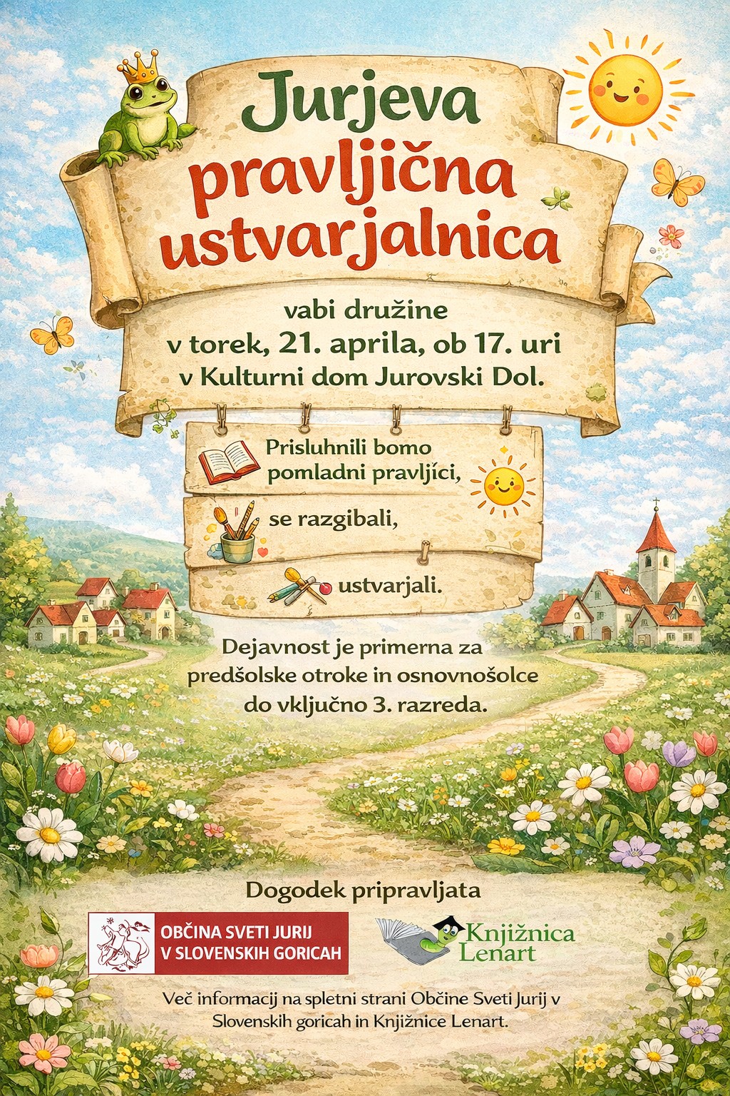 ki radi ustvarjajo, na Jurjevo pravljično ustvarjalnico, ki bo v torek, 21. 4. 2026, ob 17. uri v Kulturnem domu Jurovski Dol.