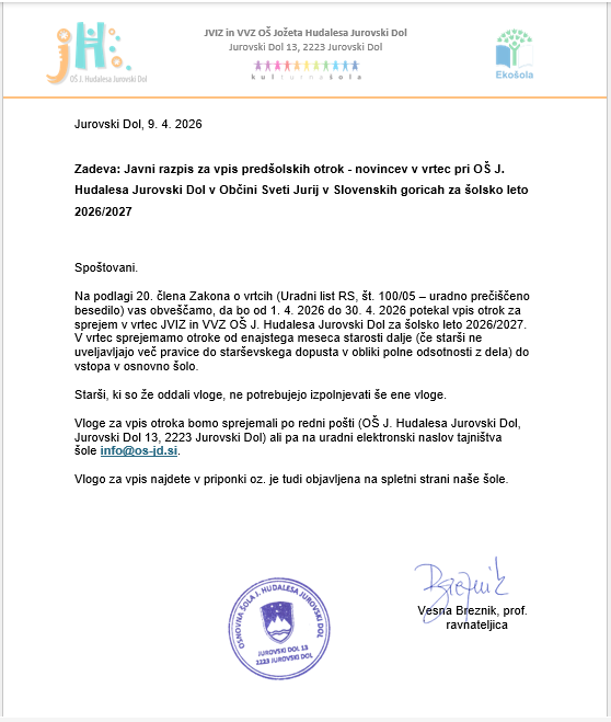 - OBJAVLJEN JE JAVNI RAZPIS ZA VPIS OTROK - NOVINCEV V VRTEC PRI OSNOVNI ŠOLI JOŽETA HUDALESA ZA ŠOLSKO LETO 2026/2027